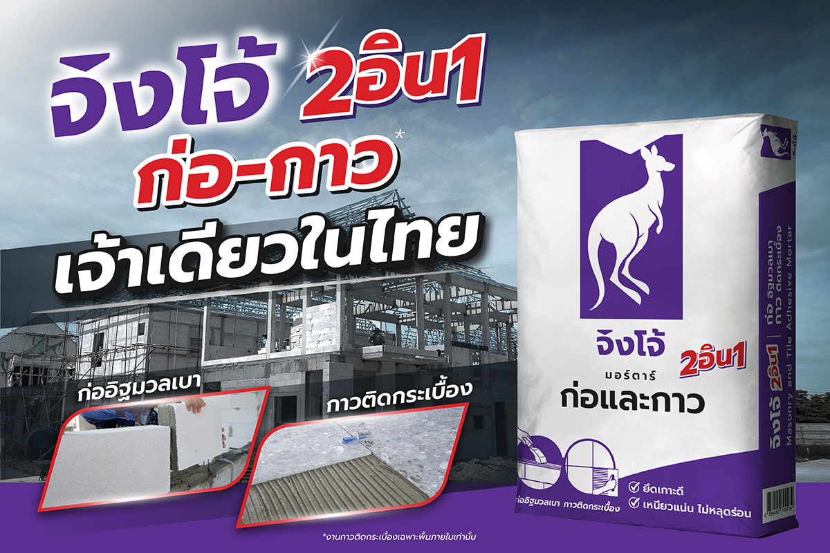 สำหรับ “ปูนจิงโจ้ 2อิน1 ก่อและกาว” สินค้าตัวท็อป ภายใต้แบรนด์จิงโจ้ ด้วยคุณสมบัติการยึดเกาะขั้ นเทพทำได้ทั้งงานก่ออิ ฐมวลเบาและงานกาวติดกระเบื้อง เจ้าแรกและเจ้าเดียวในไทยนั้น จุดเริ่มต้นสินค้าเดิมเป็นที่นิ ยมและมีชื่อเสียงมานานอยู่แล้ วในด้านงานก่อที่มีความเหนี ยวแน่น ยึดเกาะดี เป็นที่พูดถึงและรู้จักกันในหมู่ ช่าง ทีมวิจัยและพัฒนาผลิตภัณฑ์จึ งทำการพัฒนาต่อยอดสินค้าจนเกิ ดเป็นสุดยอดนวัตกรรม ที่สามารถใช้กับงานกาวติดกระเบื้ องได้ด้วย เพื่อให้ตอบโจทย์กลุ่มช่าง ผู้รับเหมาที่ต้องการสินค้าคุ ณภาพควบคู่ไปกับความคุ้มค่า โดยสินค้าได้รับการทดสอบจากผู้ เชี่ยวชาญ ผ่านการทดสอบจากแลปที่ได้ มาตรฐาน จนทำให้มั่นใจว่าสามารถทำงานใน 2 คุณสมบัติดังกล่าวได้เป็นอย่ างดี ถูกใจช่างผู้ใช้งาน สมกับสโลแกนของสินค้า “ปูนจิงโจ้ 2อิน1 เก่งทั้งก่อ เก่งทั้งกาว เจ้าเดียวในไทย“